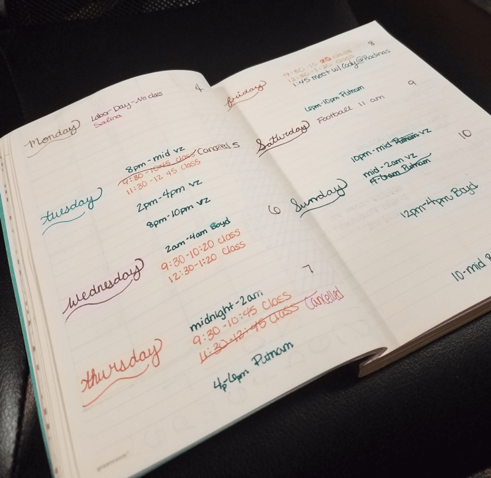 Also, here is a picture of my bullet journal weekly spread with my color-coded days of the week! (Sunday is sometimes green and sometimes gray, and I do not have a yellow pen so Monday is light green). It's obviously not the correct shape for me, but it's easier to write in it that way.