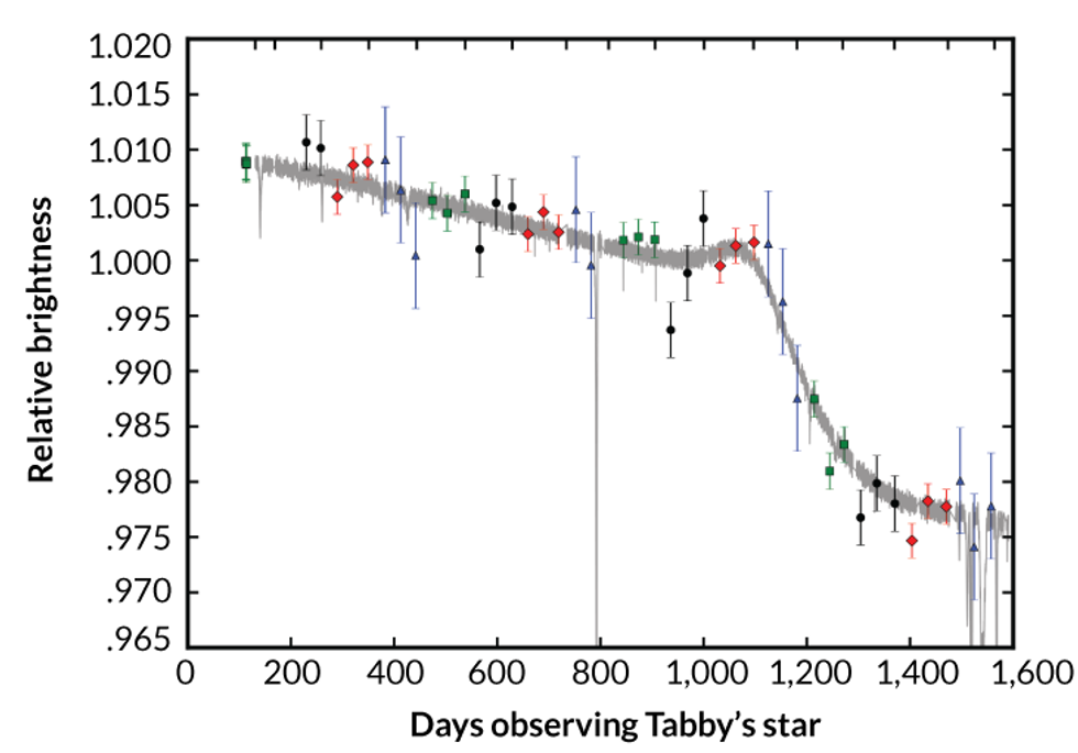 Stars do dim over time--their energy is used up and they can't glow as brightly--but none have dimmed as substantially as Tabby's star. Some people have still tried to explain this away with comets, but that answer is unsatisfying. Tabby's star truly defies any model that tries to define it. It's something we've never seen before.