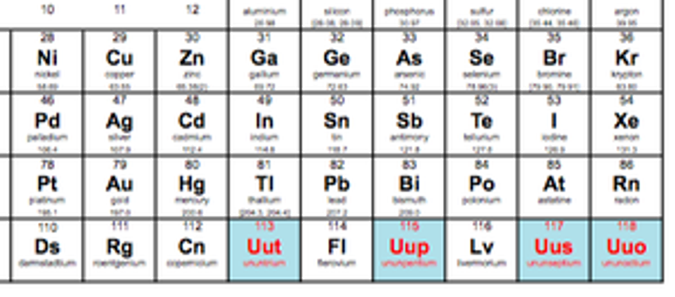 However, these poor new elements have not been officially named yet and do not have symbols either. Their temporary names are Ununtrium, (Uut or element 113), Ununpentium (Uup, element 115), Ununseptium (Uus, element 117), and Ununoctium (Uuo, element 118). Don’t worry little elements, you’ll get some names soon, because the IUPAC has officially initiated the process of formalizing names and symbols for you.