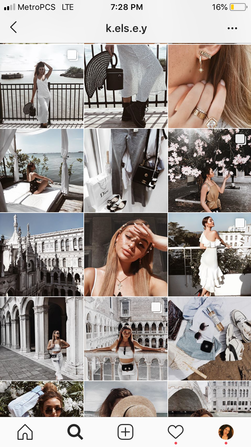 Youtuber Kelsey Simone's Instagram feed is a prime example of keeping a consistent theme with a distinctive filter and color scheme.