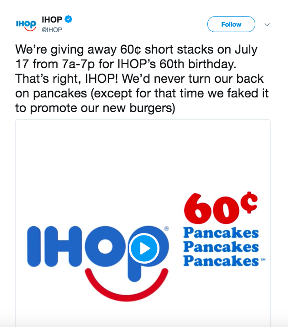 I was among the many outraged when IHOP scared us with this attempt at promoting their burgers. We all panicked, thinking it meant the end of pancakes and bacon and waffles and more. 2018 was a stressful year as it was, and IHOP, you did not help out.