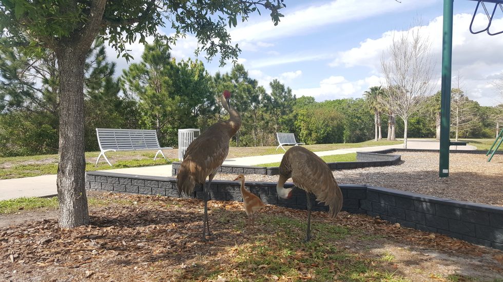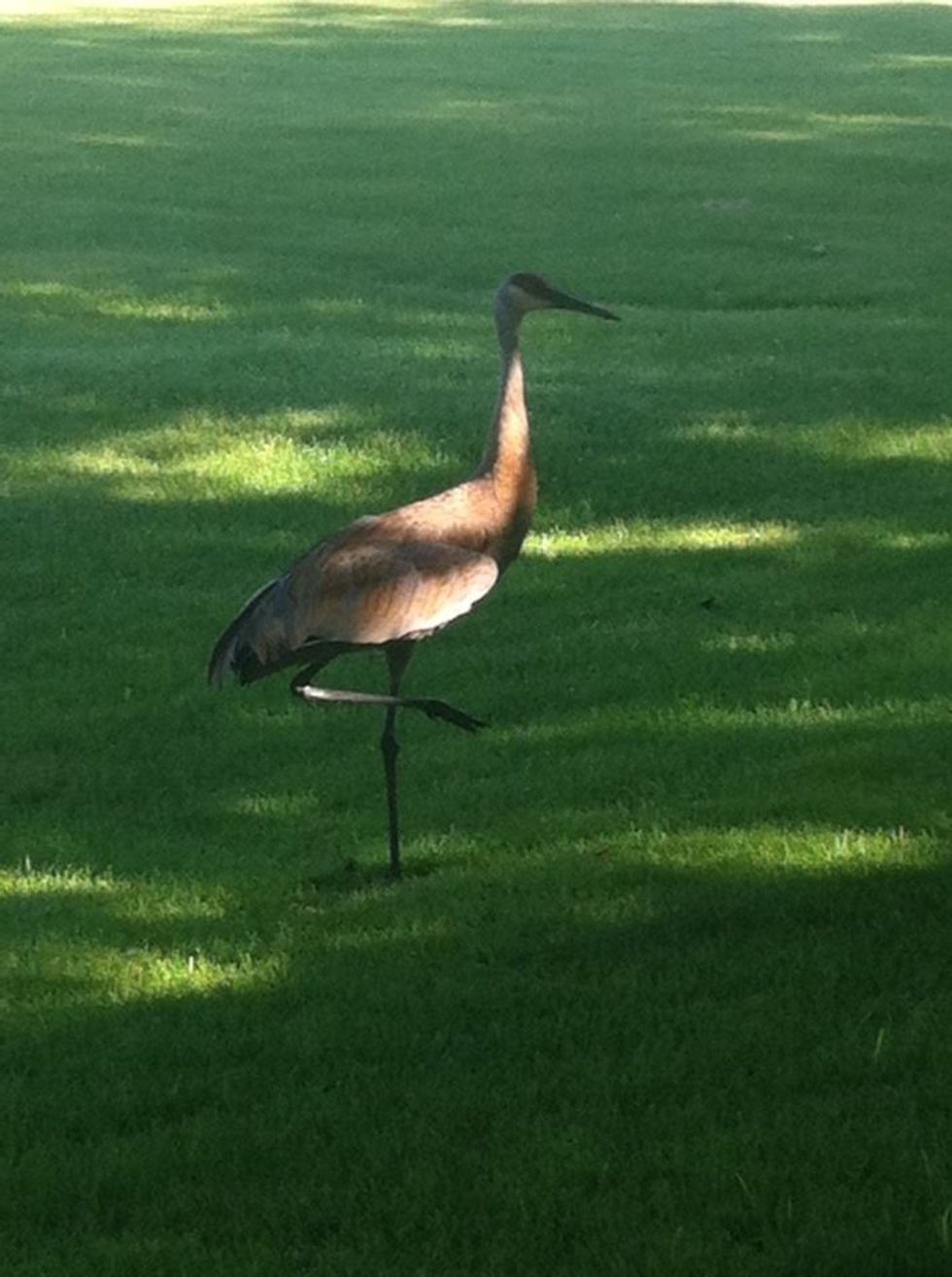 After moving to Florida, one time we were hanging out with our friends and near the playground was two adult sandhill cranes and a baby. The baby was small and orange. I had never seen a baby sandhill crane before, it looked more like a little chicken than a sandhill crane, but it stood proudly on its long legs knowing exactly what kind of bird it was. They stood grooming themselves and nibbling on grass bending their long necks with ease. They did not mind my presence; I sat near them and watched them for a long while. I am privileged to have been so close to such magnificent birds, as graceful and spectacular on the ground as they are miles in the sky.