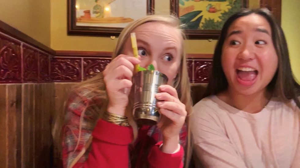 Live action photo of me drinking a Rasayana at Hoppers Soho, which is basically a mango/coconut smoothie but 100x better. I consistently have daydreams about it…