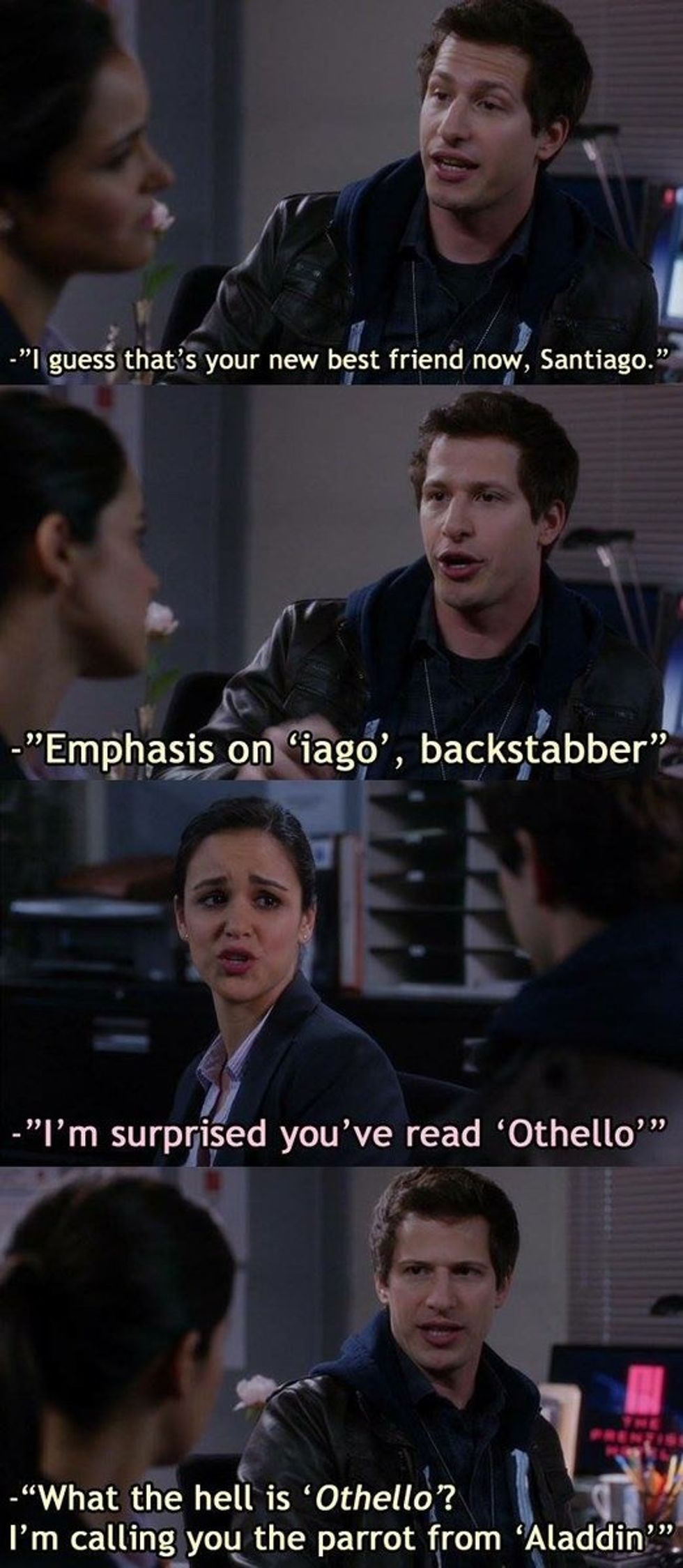 Next up: "Othello"! The plot of Othello is definitely a little complicated, so bear with me here. Basically, this guy Iago really hates his captain, Othello, and wants to drive him mad with envy by convincing him that his wife, Desdemona, is cheating on him; Iago is successful, Othello goes into a rage and kills Desdemona because the play is a tragedy and has to end with everyone being sad. However, Othello is much funnier if you read all of Iago's lines in Dr. Doofenshmirtz's voice, since they just have the same energy (except everyone like, LOVES Iago despite all his sketchy behavior; I love this play but honestly it is idiot plot at it's finest).