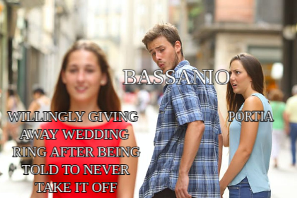 Last but certainly not least, we have "The Merchant of Venice", and the relationship between Bassanio and Portia. In the latter half of the play, after Bassanio and Portia are engaged, Portia gives Bassanio this really cool ring that like represents all their love and how sacred their bond is before Bassanio returns to Venice for his best buddy's trial. Some hijinks ensue where basically Portia, being the badass genius she is, poses as a male lawyer that essentially saves Bassanio's friend Antonio from an execution, but then, still posing as the lawyer, pressures Bassanio to turn over the ring in an act of gratitude, and he does. Needless to say, when Bassanio comes home Portia has WORDS with him - but don't worry, they stay together and have a happy ending.