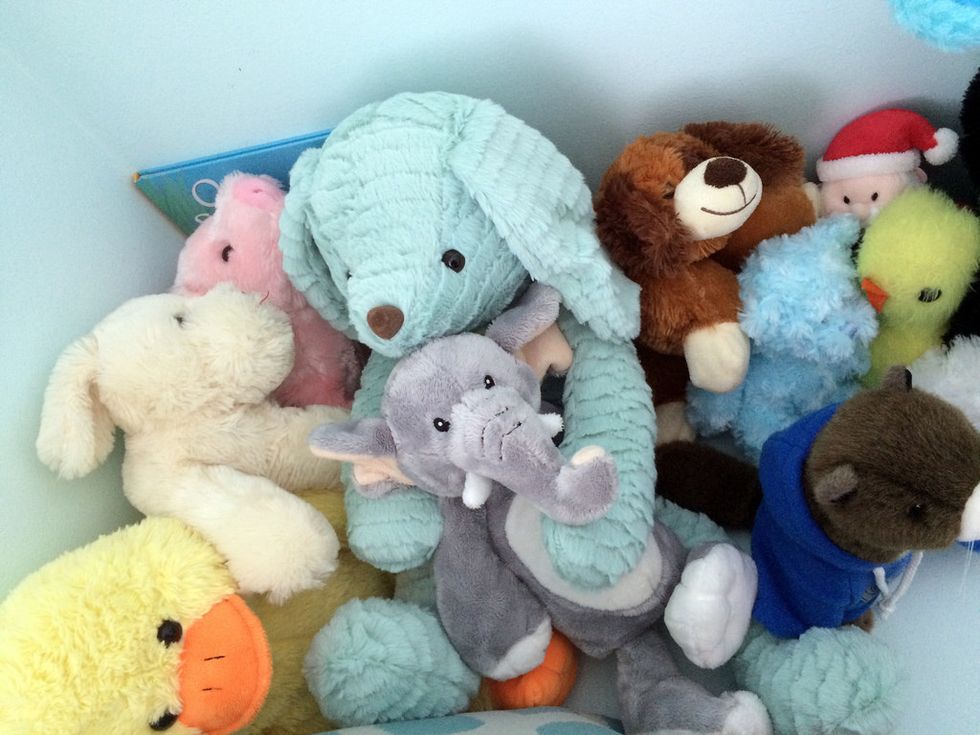 Sleeping with stuffed animals, baby blankets, the like.