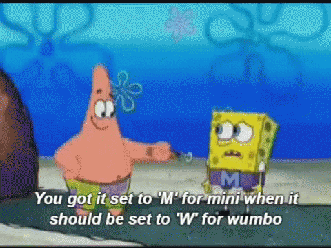 25. "You got it set to M for Mini when it should be set to W for Wumbo. You know, I wumbo, You wumbo, He she me wumbo, wumbo, Wumboing, We'll have thee wumbo, Wumborama, Wumbology, The study of wumbo? It's first grade, SpongeBob!"