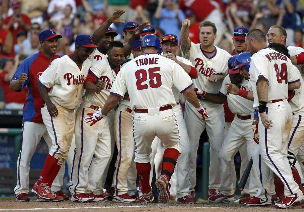 His signing represented a change in the culture of Philadelphia baseball; the Phillies had always been low-spenders in a large market. Thome’s deal for 6 years and $85 million— to that point, the largest in franchise history— was the biggest splash the Phillies had made since signing Pete Rose prior to the 1979 season. Signalling to the baseball world that the Phillies were serious about contending, the deal renewed interest in a team that Philadelphians had largely abandoned following the 1994 strike. His close relationship with Charlie Manuel brought the beloved skipper to Philadelphia, and his presence in the clubhouse played a key role in the development of young players like Chase Utley and Ryan Howard, who would form the core of the 2008 World Champions.
