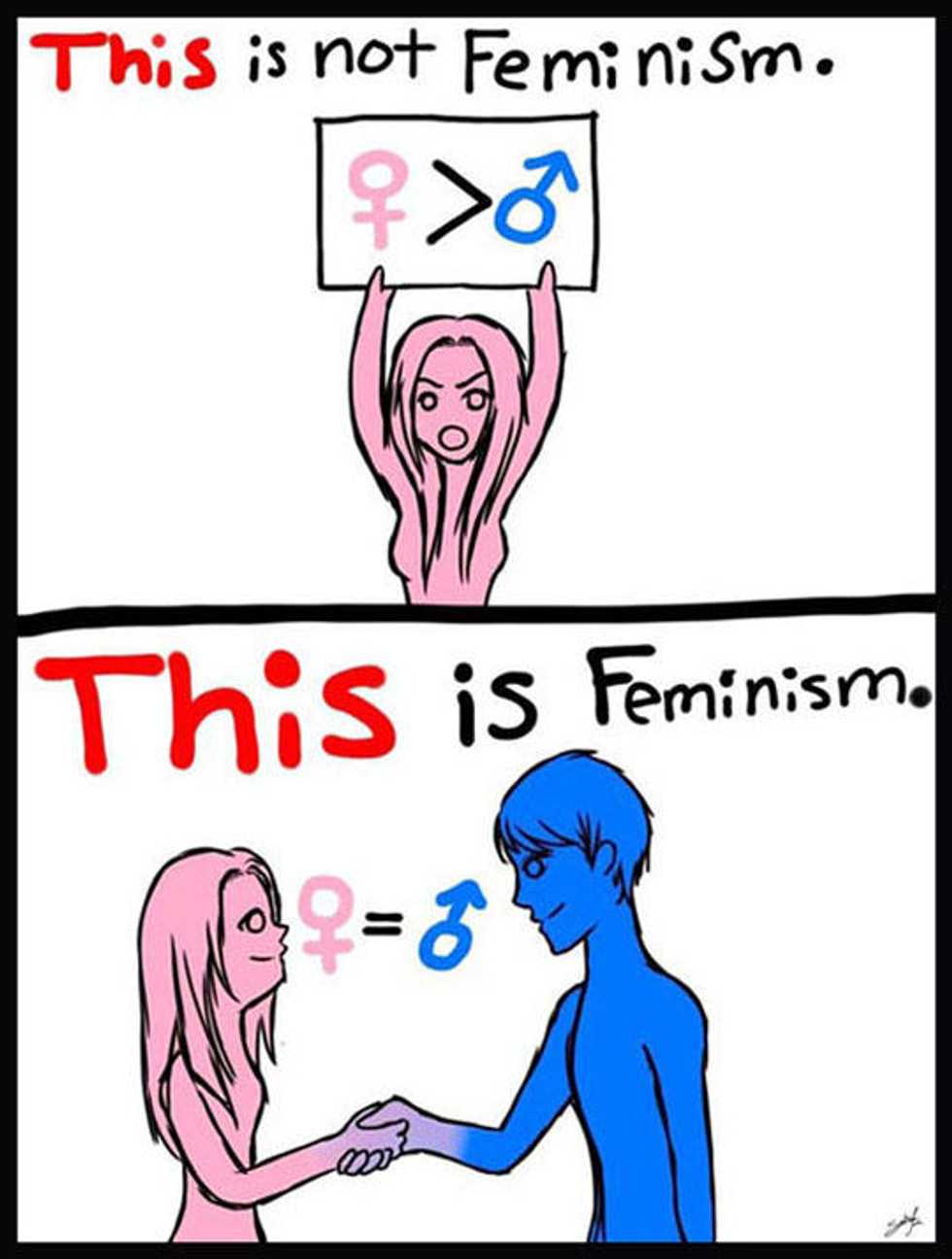 Feminists are anyone, male or female, that want women to have the same rights a man does. Now you scratch your head and say to yourself, "but women fought for their rights and won back in the 1920's." Yes, today's feminist movement is much more than rights from the state. It's about fighting stereotypes, double standards and how women are being taught to represent themselves. It's about woman who are aspiring to do much more than be a pretty face and a housewife. Here's a look at some of the most popular memes on the internet that misrepresent feminism.