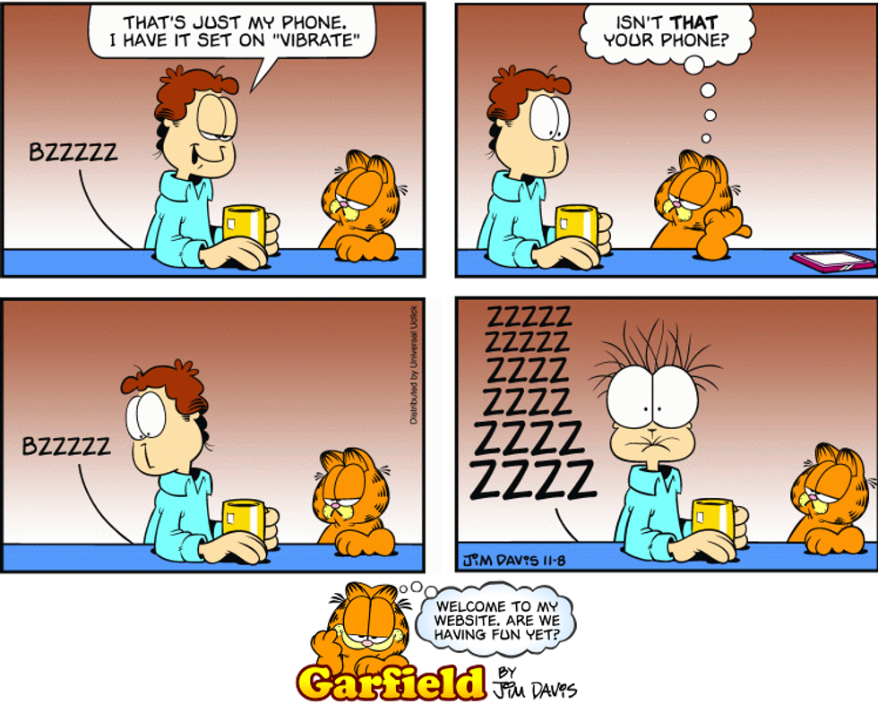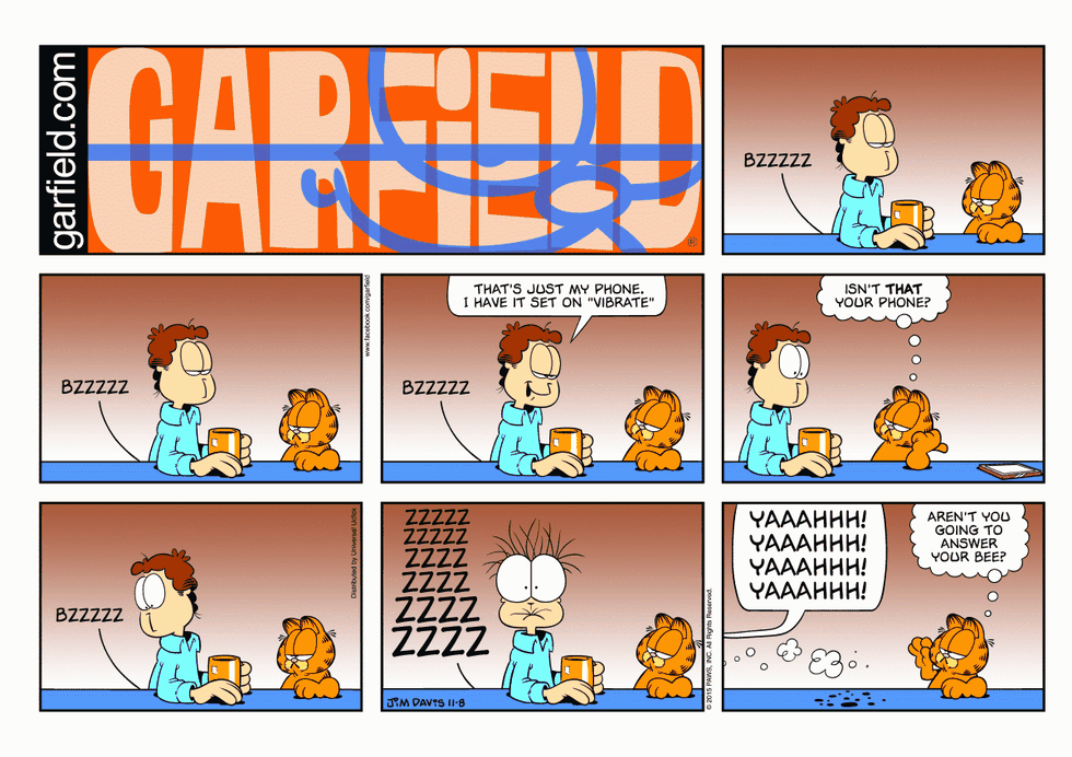 Okay, so things are about to get real a second here at Odyssey, and perhaps a bit… odd. Bear with me. I’m going to try to discuss this without being graphic, so forgive me if my words stray into overly-clinical technical vocabulary, but there’s no better way to say this: on Sunday, November 8, 2015, the following Garfield Comic came out which proves that lovable cat owner, Jonathan Arbuckle, is a user of vibrating dildos-- not just a user, but an aficionado.