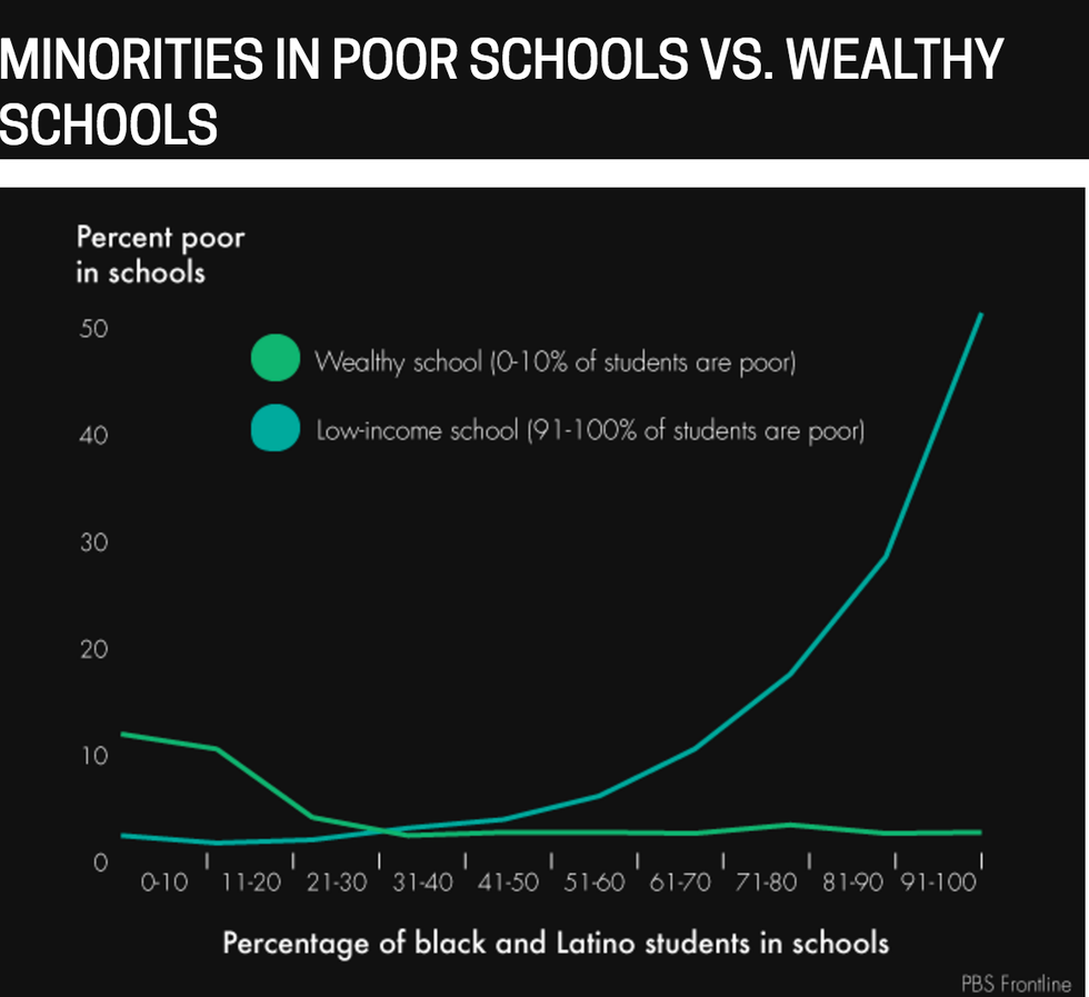 Our world, now more than ever, needs its young people to be as prepared for success as possible. This continued segregation directly carries on the plague of systemic injustice inflicted on poor students of color. To close, here is a graph from PBS Frontline depicting the staggering racial gap in modern day education.