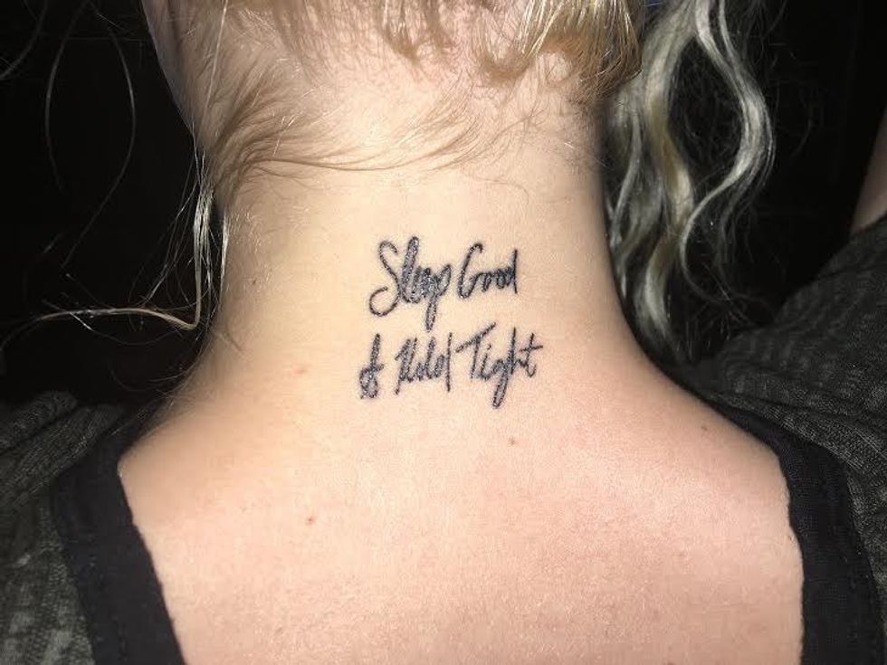 My lovely best friend was the catalyst in this mission-- she would be seeing Wild Child at a Texas music festival in May. When she approached Kelsey about my tattoo idea, not only did Kelsey remember who I was (whoa!), but she also loved the idea and wrote "Sleep Good & Hold Tight" in her cursive handwriting for me to get tattooed on the back of my neck.