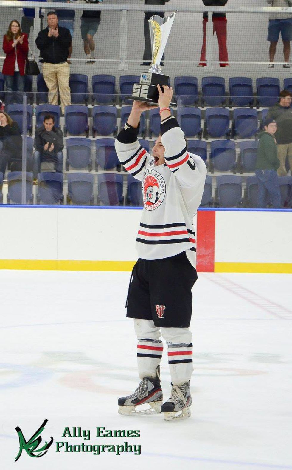 Despite the fact that I was 1,000 miles away from school this weekend, our #3 division-ranked UT Spartans were competing for the Southern Collegiate Hockey Conference championship cup and I was determined not to miss it. The team kicked off the tournament with a 21-6-1 record. I kept up with the @UTampaHockey Twitter account during the Friday game against #6 FAU, which we won (5-1), and the Saturday game against #2 UCF (6-1), which we also won. Then Sunday rolls around and it’s time for the championship game against #5 USF, who pulled off a win against FGCU, the #1 ranked team in the division. Our Spartans won 6-3 (woohoo)! Lucky for me, USF streamed the game on Periscope so I got to watch it even 1,000 miles away. So first of all, congratulations to the University of Tampa Spartans for winning the SCHC championship cup, and now it’s time for them to prepare for nationals, which will be held March 14-18 in Columbus, Ohio.