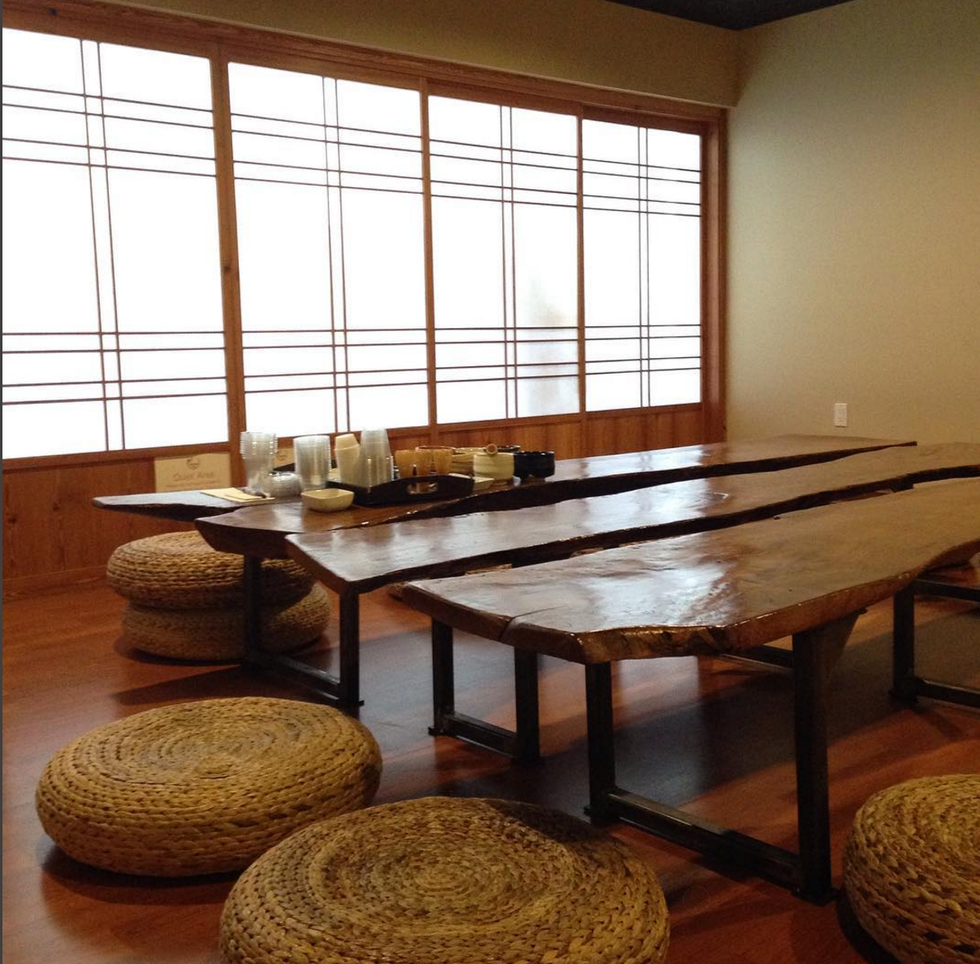 The tranquil atmosphere is perfect for studying or just having a chill conversation with a friend whether you're relaxing on the outdoor patio or inside the Japanese tea room. This unique Japanese tea room was custom-made by a local carpenter and designed to reflect the traditional Japanese-style room.