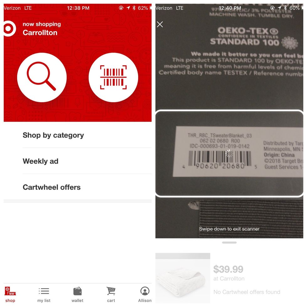 How do you use the app? This part is kinda really cool! You get to go scan everything you're buying at target. Just like this. But when you open the app you will first be brought to the screen on the left the you all click the barcode and then you will be brought to the screen on the right.