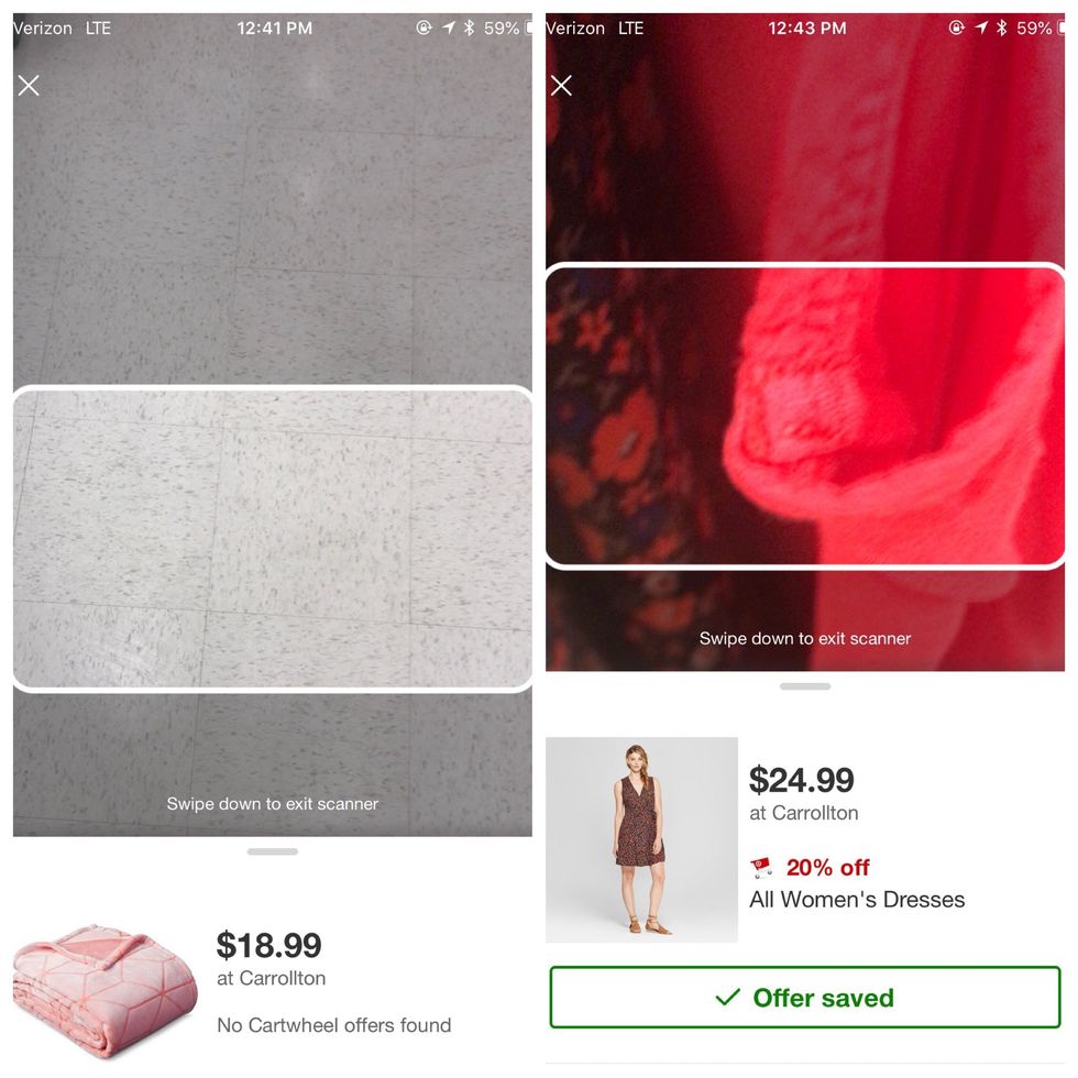 After you scan the item you will then be told by the app if it has a cartwheel offer with the item or if it doesn't. The one on the left does not have a cartwheel offer with it but the one of the right does have a cartwheel offer with it. That dress was 20% off and they automatically saved the offer to your wallet on the Cartwheel app.