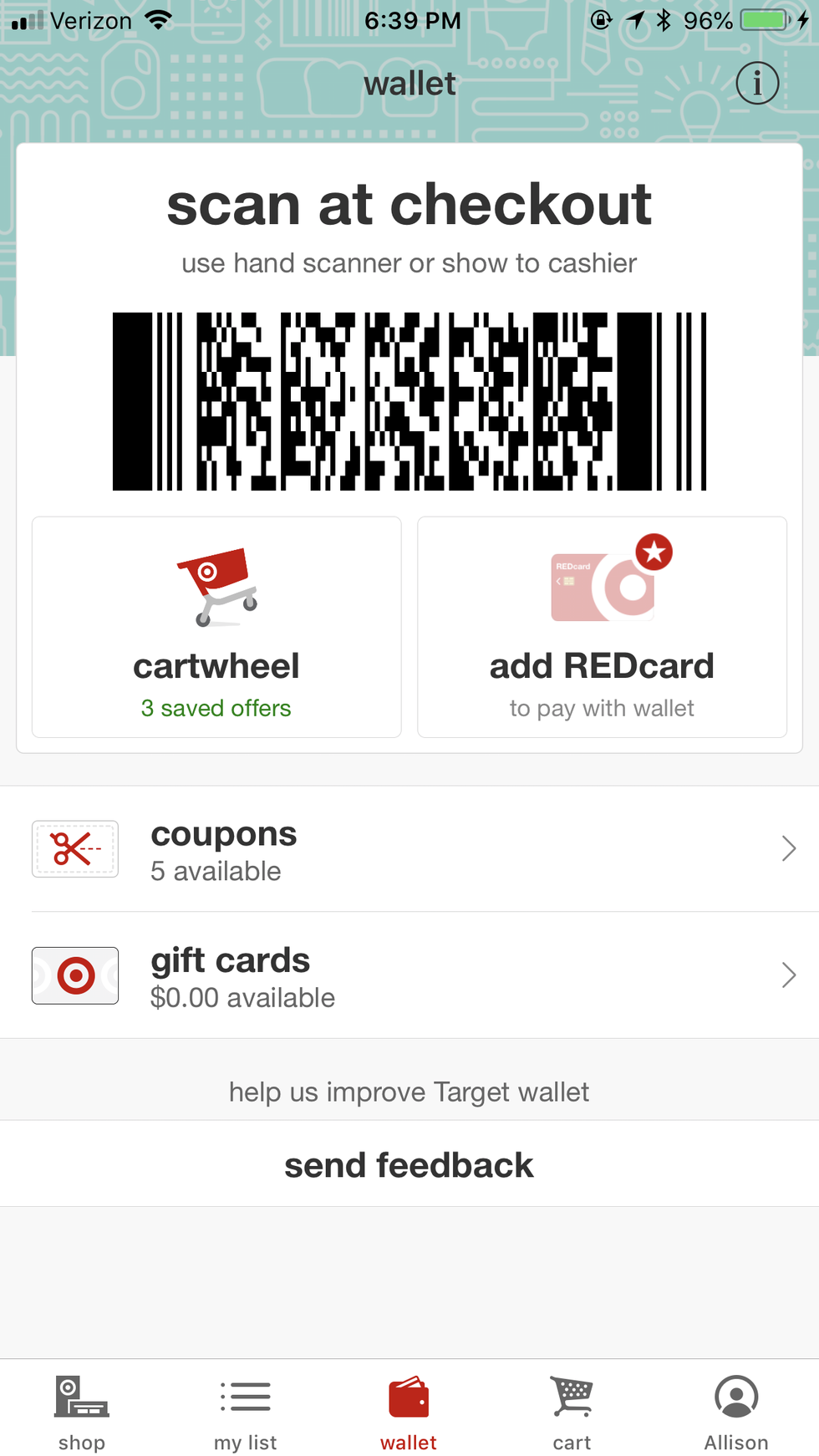 After the offer was saved to your wallet you will go back to the home screen of the app and click the wallet in the bottom middle. After you click that you will be brought to a screen that looks like this, and then the cashier will scan your online card at checkout, and then your discount will be taken off.