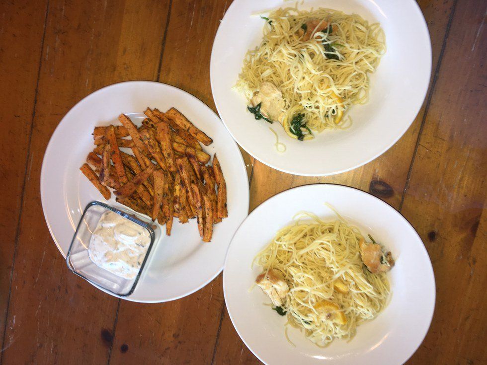 My lovely boyfriend and I made sweet potato veggie fries and a lemon butter chicken pasta. The process turned into a very fun and yummy date night.