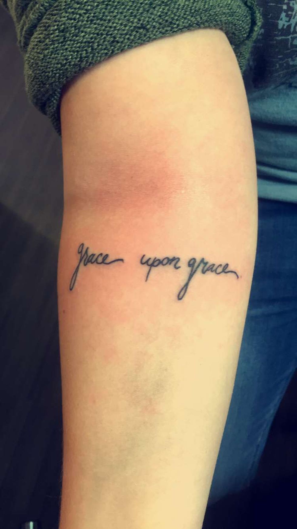 This tattoo serves as a daily reminder to me that the unending grace that Christ poured into us is meant to also be poured out to those around us. I am not meant to keep it hidden. This grace upon grace that is lavished on me is something that Christ gave us to give to others. The same grace that washes over me can and will wash the dirtiest hearts; I know because He has washed mine. This tattoo reminds me that I need to be gracious in my everyday life and the Lord provides it all, for me and those around me.