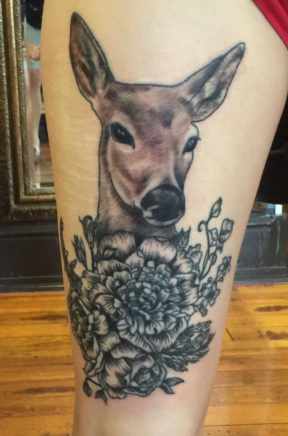 This is my beautiful tattoo. The reason I got it was because I have scars on my thigh from years of struggling with self harm and depression. God helped me overcome that battle and I've been out of the grips of self harm for over two years now. That battle I had left scars, and when I see them I thank God for what He's brought me through, but they are also a reminder of those hard times. I didn't want to see those scars every time I looked down at my leg. Plus there are still times when that way of coping calls to me, even after two years. I wanted something beautiful to look at. I wanted something to admire. I wanted something that was too beautiful to destroy. I felt that if I had a beautiful tattoo l would love it too much to ever think about destroying it with self harm. My tattoo doesn't completely cover my scars. If you look to the left of my cute little deer you can still see them. The point wasn't to cover them. They are still a part of my past, still a reminder of what God has brought me from. But now whenever I see my thigh I see the cutest little deer and beautiful flowers. My eyes automatically go to my tattoo and not my scars. I don't feel self conscious about people noticing my scars. They see my tattoo and most time I get compliments and it makes me feel good.