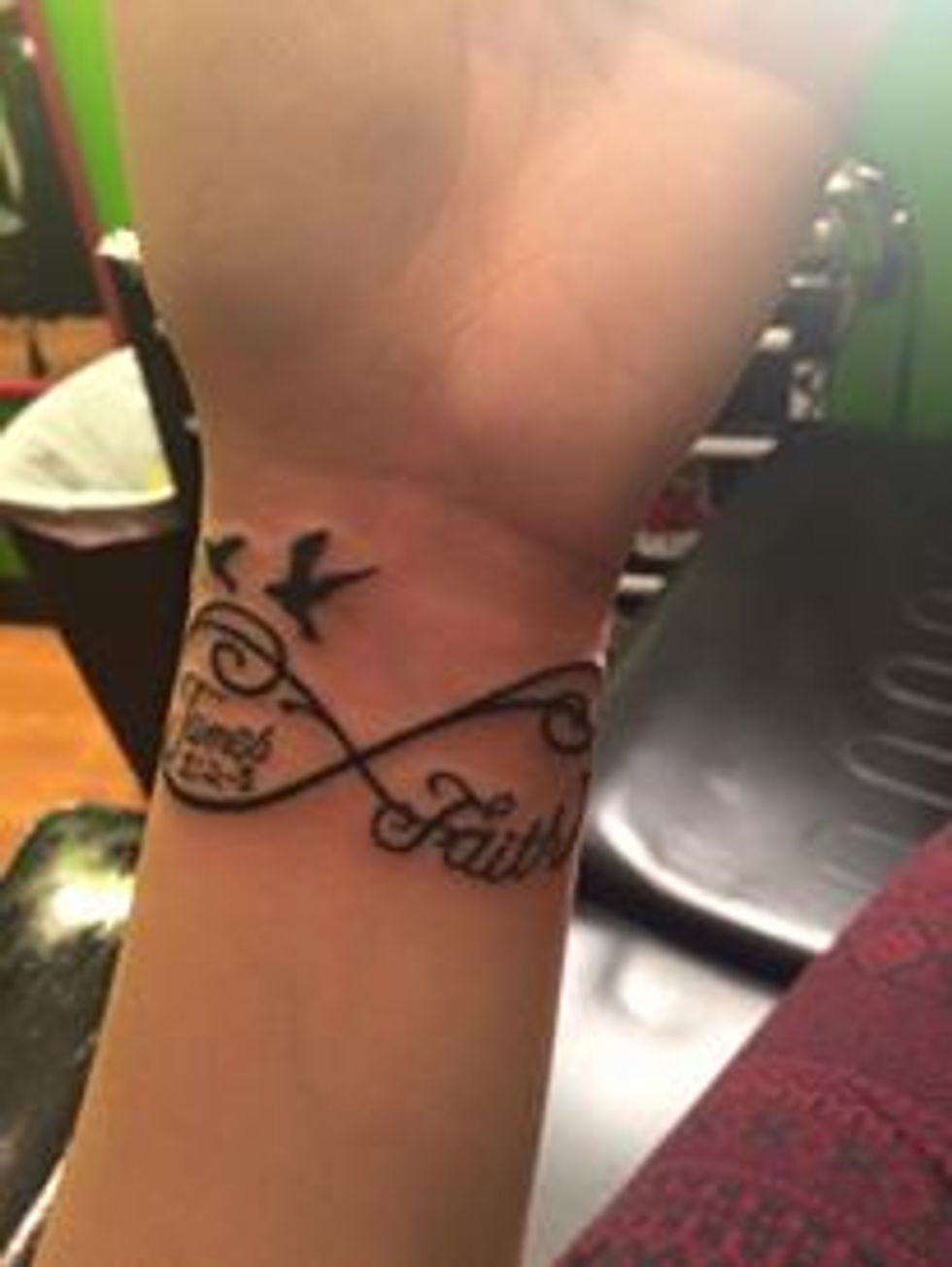 First off, I am a devout Christian who believes the main purpose of life is to love others and share God’s word. For me, I currently only have one tattoo on my wrist. It’s an infinity sign with the word faith, three sparrows in various sizes and the scripture James 1:2-3. This tattoo has a lot of meaning for me. “Consider it pure joy, my brothers and sisters, when you face trials of many kinds, because the testing of your faith produces perseverance.” This has multiple meanings for me, but I will say that it has everything to do with having joy in times of struggle. Over time, you will grow to conquer it, because you build up endurance to persevere through it all. I want to always have strong faith, even when I go through my own trials of life. The sparrows represent, from the oldest to the youngest: my late grandmother, my mother and my little sister. It reminds me of my family in the sense that we try to remain strong even when life gets tough by having faith and being joyful in it.