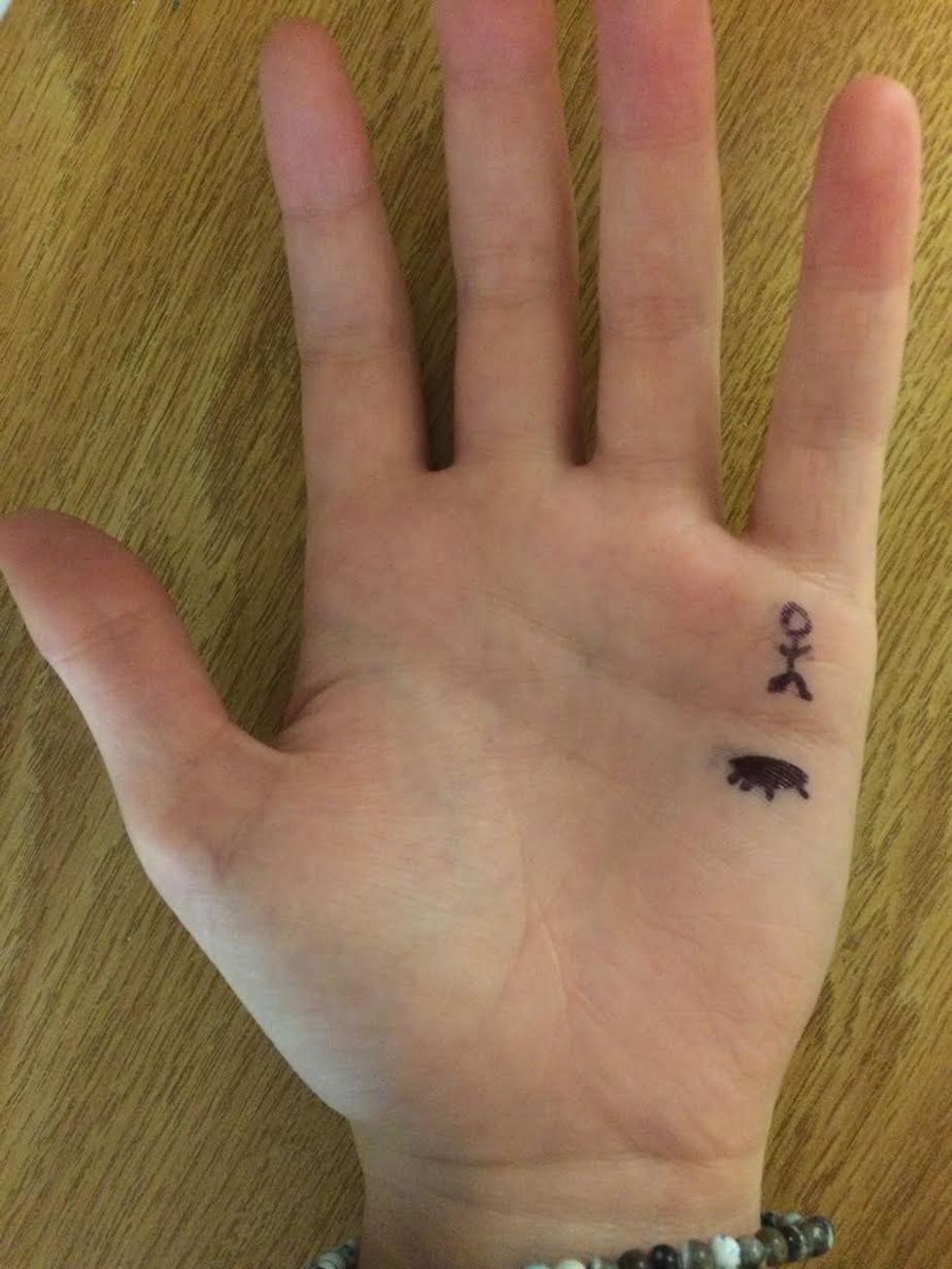 It looks kind of dumb, just a stick figure on a trampoline, but I draw it on my hand whenever I need a pick-me-up and it makes me happy. Unfortunately, with just a pen, the tattoo wears away after I wash my hands but I wish it could stay. Am I worried about what my tattoo would say about me? No, because I know what it will say.