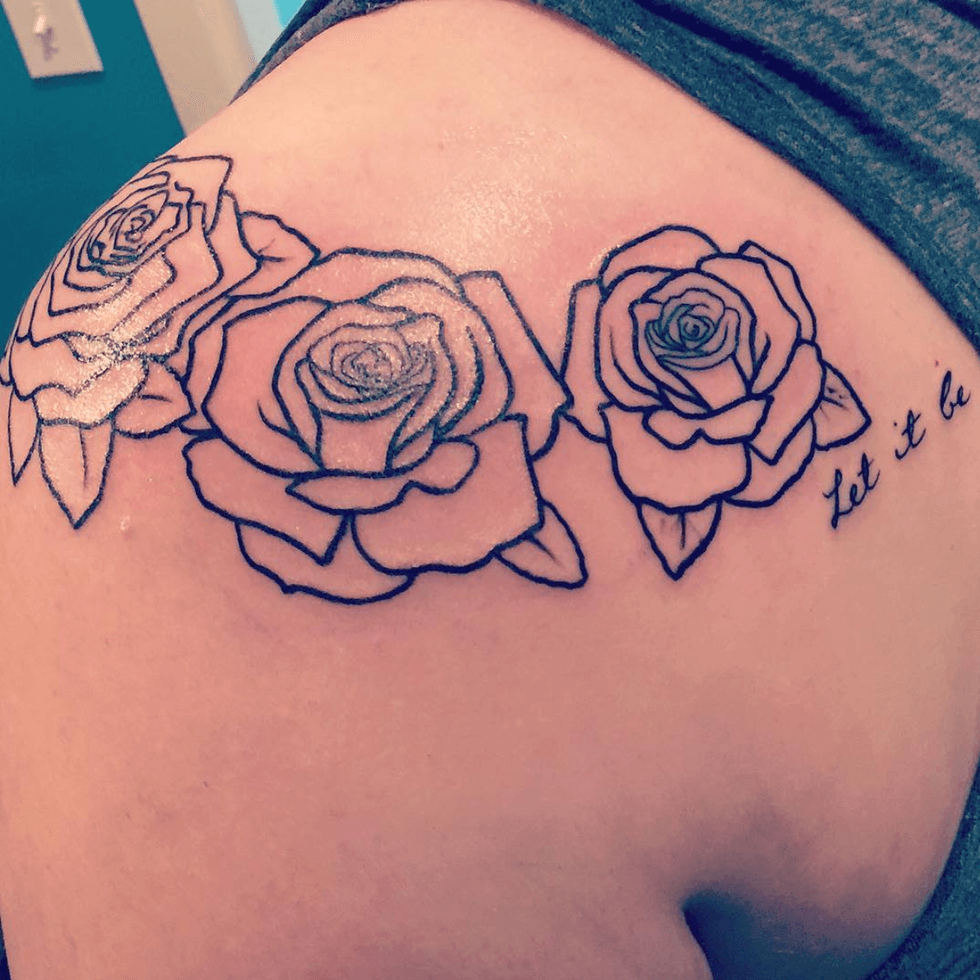 My first tattoo was a large piece across my left shoulder of three roses and The Beatles lyric "Let it be." I had wanted that phrase for about four years, but it took awhile for me to come to terms that it was OK to get a tattoo and go against my family's beliefs (and also prepare myself to face the needles). My fiancé (who was my boyfriend at the time) had two tattoos and convinced me the pain was bearable and the end result was worth it (and boy, was he right).