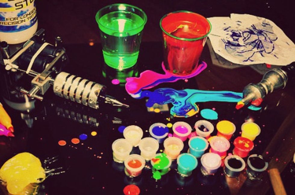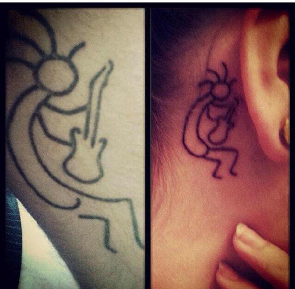 “This was my very first tattoo when I was 17. It was spontaneous, but I knew what I wanted. This is a Kokopelli Indian playing guitar, and my dad's very first guitar. One thing me and him could always connect about was music, so I figured it was a nice fit. Also he was completely against the idea of me getting a tattoo, but when he found out what it was, how could he say no? I'm happy knowing I will always have a part of him, and a nice one at that.”