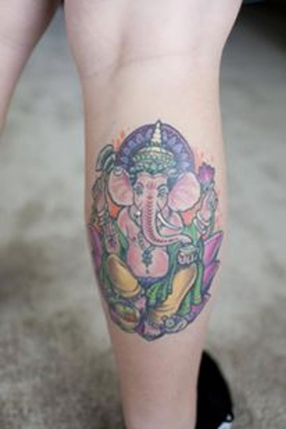 "Every part of him represents something that I try to strive for everyday. He has a big head, to think big. Large ears to listen more. Small eyes to concentrate. A small mouth to talk less. One broken tusk, and one normal tuck to represent keeping the good and getting rid of the bad. The mouse at his feet represents keeping your desires under control. All of those are reminders that I carry with me always, and remind myself of the good I can do."