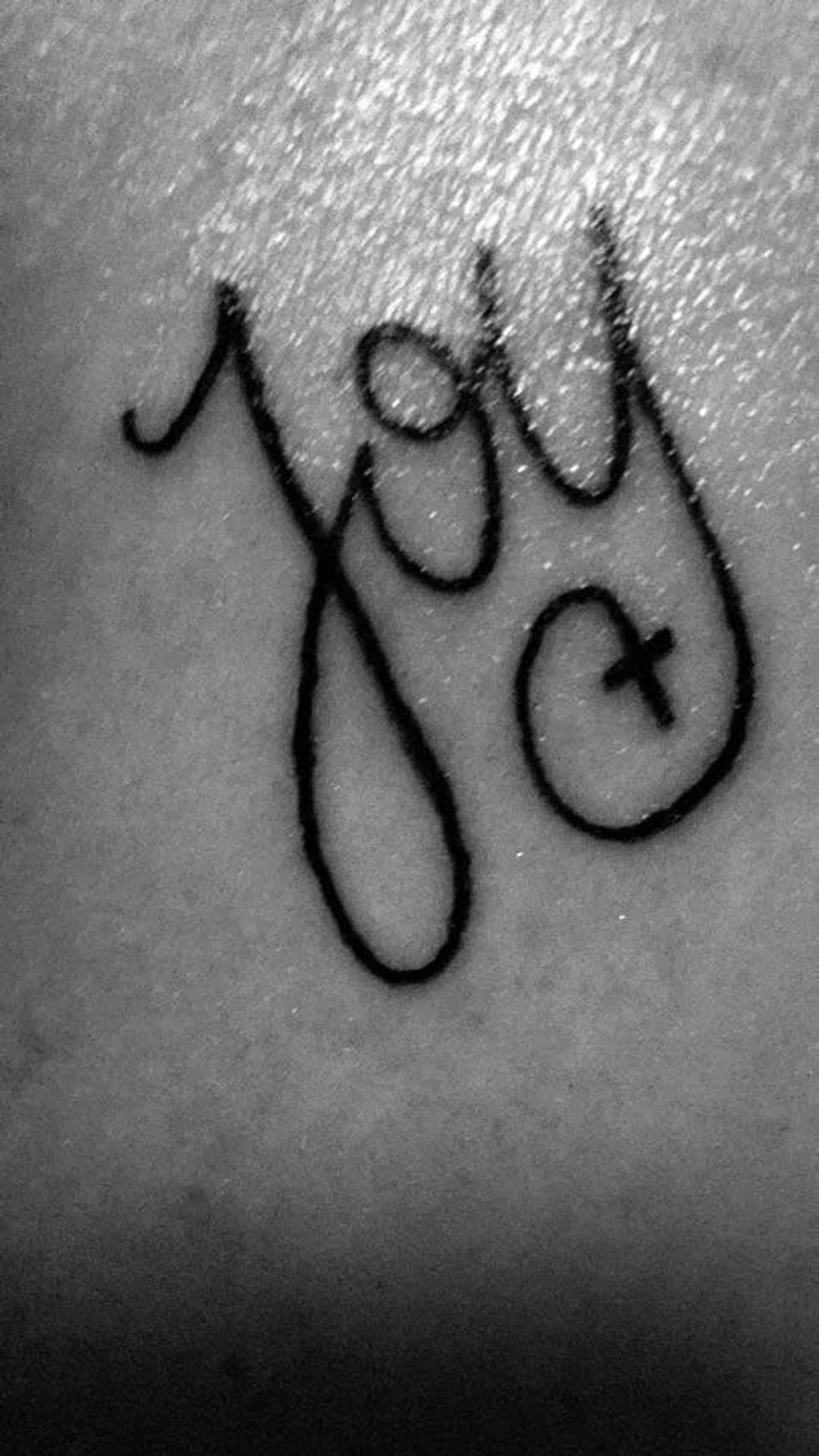 “I decided to get my second tattoo, 'Joy,' for my grandmother who passed when I was younger. Joy also happens to be my middle name, so they both have really significant meanings to my decision in getting it. I decided to insert a cross onto the tail of the letter 'y' in memory of her passing. While deciding on the tattoo itself, I also decided to place the tattoo on my upper left chest near my heart in remembrance. Joy also happens to be a universal word used to imply happiness! Overall, it's a very meaningful tattoo to me and it happens to be my favorite out of the three I currently have.”