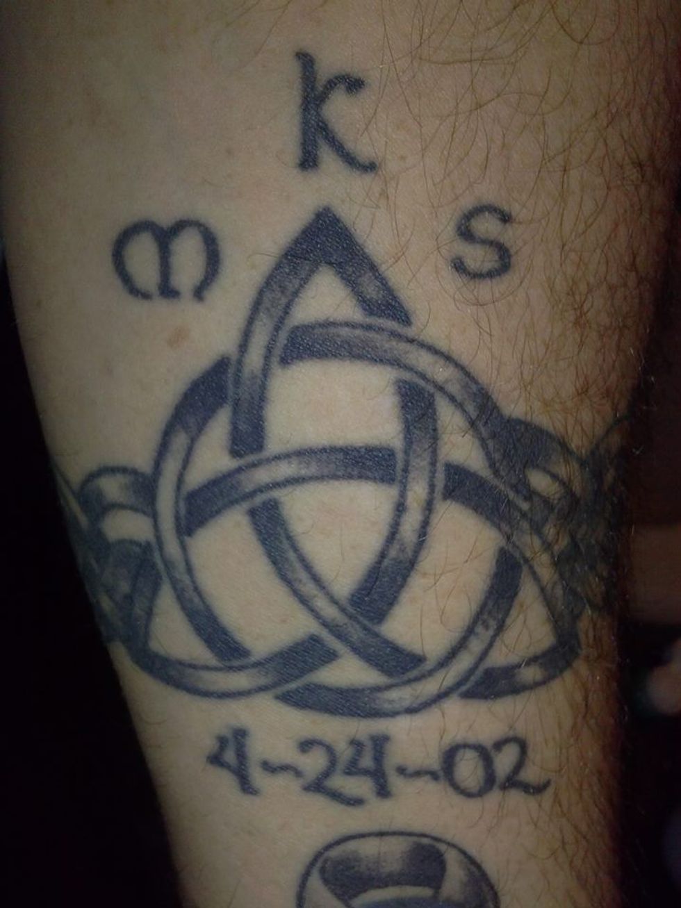 “The Celtic Cross and the Triquetra (AKA Trinity Knot) tie my religious beliefs with my Celtic (Pagan) ancestry. They have my sons initial and birth dates on them and the Celtic knotwork bands go around my arms. This symbolizes me being bound to them for eternity (the knot work really has no beginning or end). Each of the bands are different from each other, like my sons.”