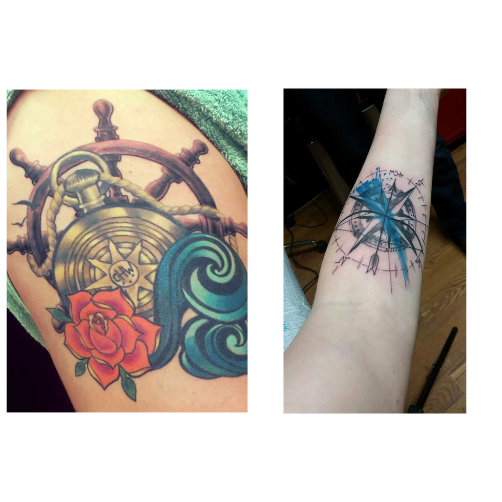 "That tattoo is a collaboration piece between my sister and I, who are really close. She also has a compass but a different interpretation based on personal tattooing styles. When we were little girls, my Mom used to always tell us that no matter what happened, we would always have each other, so it kind of embodies the idea of a True North and how no matter how we lose our way, we will always find each other in times of struggle. The flower represents our Mom because it is in her favorite colors and the waves and captain's wheel represent where we grew up, Florida, and how much I love the water."