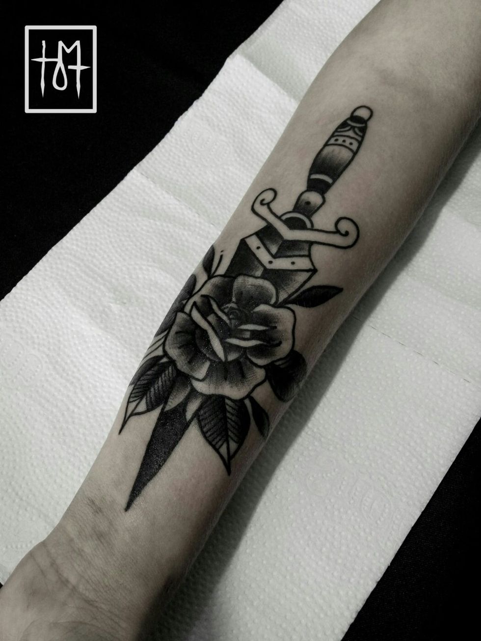 Black and grey traditional dagger and rose by Helena Matuti