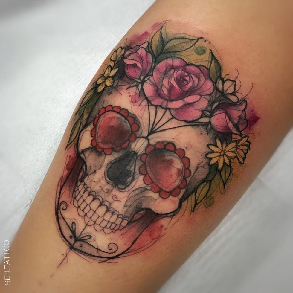 Watercolor skull and flowers by Renata Henriques