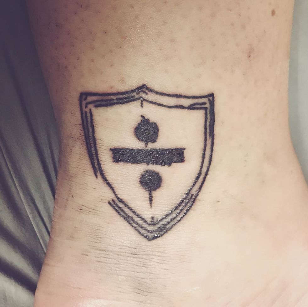 The last tattoo that I currently have I just got at the end of this semester. When thinking of getting this tattoo, I was inspired by Ed Sheeran's song "Save Myself." I was going to get the lyrics of the song but I already had a quote so it took me a while to figure out how I wanted a song that changed my life tattooed on my body forever. I realized that every song on his last album each had different artwork dedicated to it. The artwork for "Save Myself" was a divide symbol inside of a shield. I decided to get that as a tattoo on the inside of my left ankle. When my family saw this one they said, "Wwhy would you get such ugly artwork on your body? The lines are all screwed up." They didn't realize the significance it had an that's how the artwork was done.