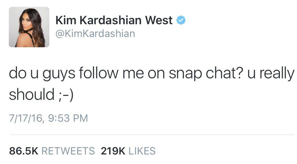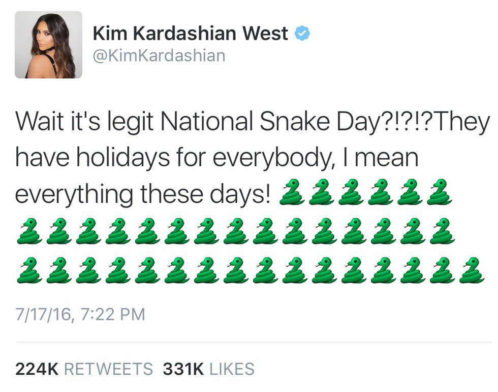 To rewind, Sunday evening, Kim Kardashian posted a cryptic tweet mentioning the fact that National Snake Day was that weekend. She went on to say “They have holidays for everybody, I mean everything these days.” Shortly after, Kardashian tweeted fairly cryptically again, writing “do u guys follow me on snap chat? u really should ;-) [sic]” And thus began a whirlwind of hashtags, charged Instagram posts and memes to last everyone throughout the summer.