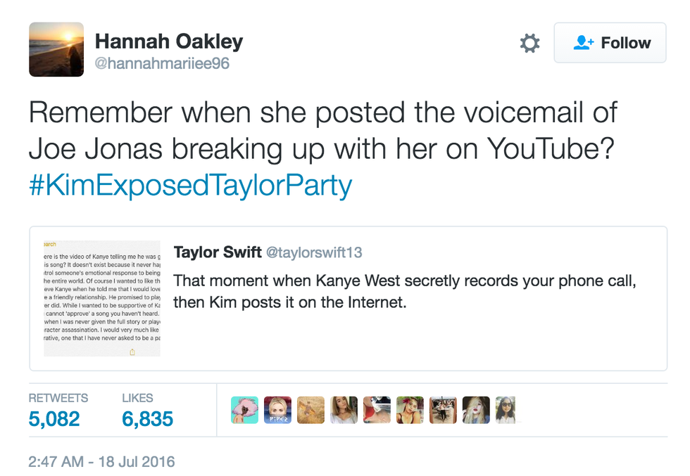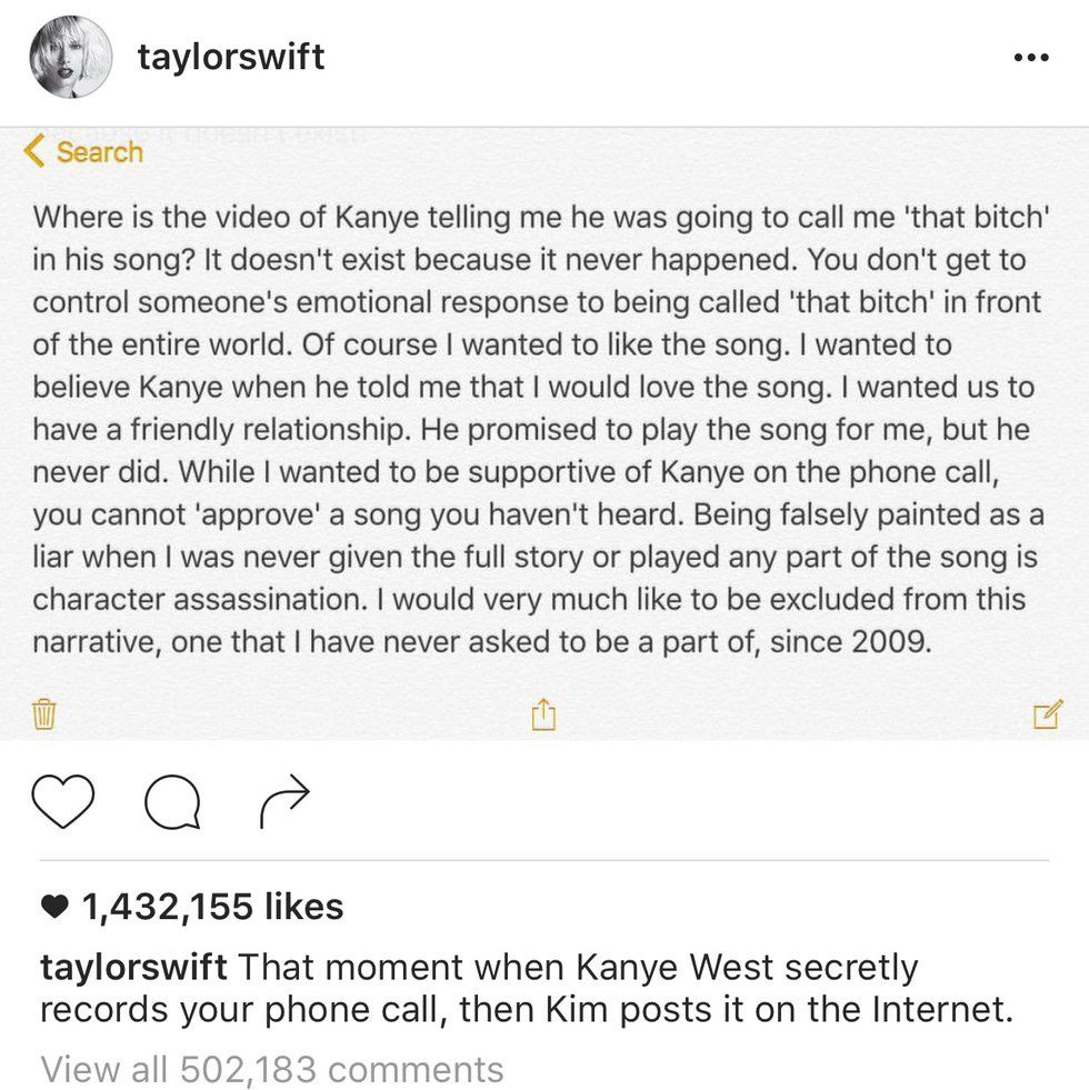 When the hashtag #KimExposedTaylorParty began trending on Twitter, new memes were thrown in every direction. No one was safe. Almost too quickly after Kardashian’s string of Snapchat videos, Swift responded with an emotionally charged Instagram post, which appeared to be a screenshot of a note written on her cell phone (a celebrity’s favorite tool for making a statement). In the note, Swift references the Snapchat videos, asking, “Where is the video of Kanye telling me he was going to call me ‘that b*tch’ in his song? It doesn’t exist because it never happened. You don’t get to control someone’s emotional response to being called ‘that b*tch’ in front of the entire world.” She also claims that West was supposed to play the final song for her, but failed to do so.