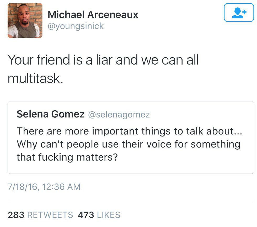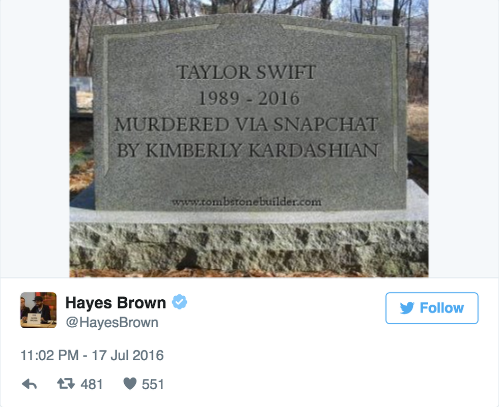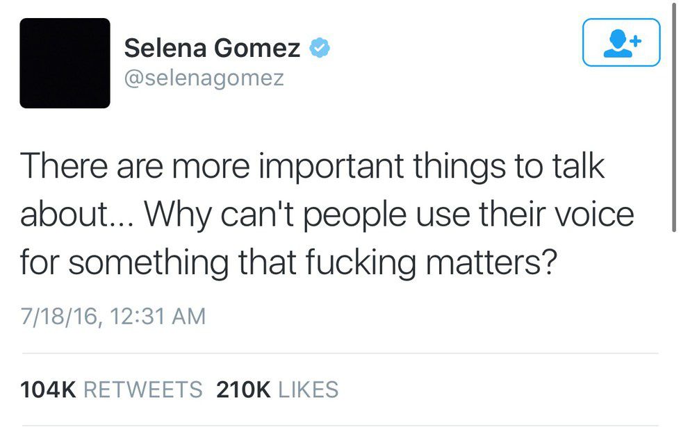 While several of Swift’s string of friends came to her defense, most of them involved urging the public to talk about something else. Selena Gomez tweeted directly after the incident: “There are more important things to talk about... Why can't people use their voice for something that f*cking matters?” This tweet also prompted a myriad of responses from the general public, mostly involving a large amount of people replying to her tweet with links to the touching statement Kardashian made about the Black Lives Matter movement earlier in the week. Of course, there was an inordinate amount of meme responses as well that we all can’t help but chuckle at.