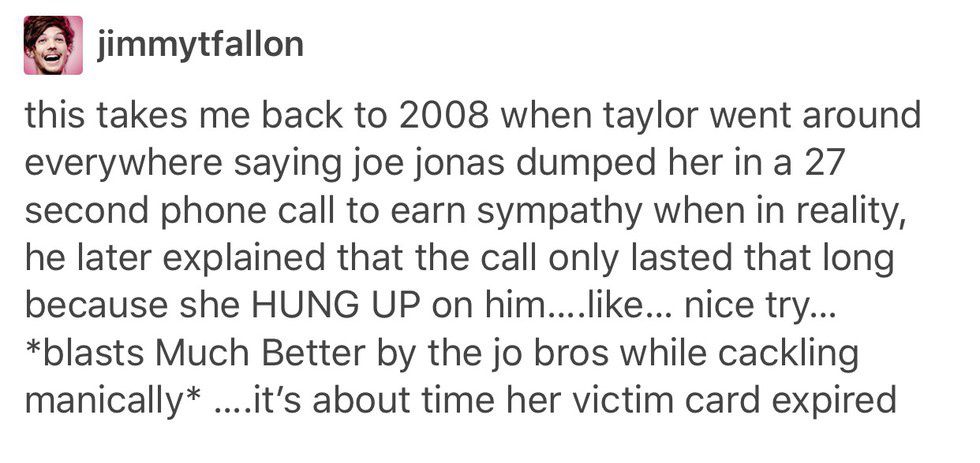 On the other side, millions of Twitter users relished in the exposure of the underhanded nature of celebrity culture and in the fact that Swift was exposed for the way she controls her squeaky-clean public image—an image that seemed to come crashing down after the videos were released. Many wondered how so many people could turn against Swift when it seems to be true that the second part of West’s lyric (“I made that b*tch famous") doesn’t appear to be approved in the phone call. It likely has to do with a chain of behavior from Swift and her team that has gone on throughout Swift’s career: her immediately assuming the role of the victim.