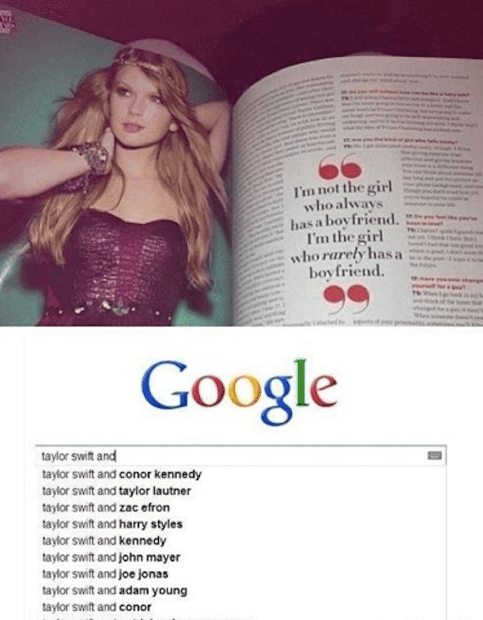 I feel like Swift needs to realize that maybe it isn't the guys that she is dating but that it is her. Maybe she needs to get some therapy before jumping into her new relationship. If her past relationships keep failing so quickly, why does she think a new relationship is going to where. Or maybe she has a different motive...her career. After a big break up she has so much inspiration for new music that an album usually comes out. Maybe she just dates a guy and if she realizes he has no potential for inspiration than she breaks up with him or if she realizes he does give her inspiration , she continues to date him until her album is complete and then breaks it off.