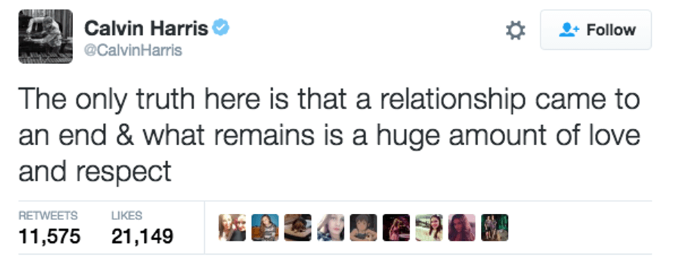 The beautiful 15-month relationship has come to an end, and it appears to be very amicable and that the next T-Swift album would tell the story of them, nicely. However, this week, things took an unexpected turn. This Wednesday, Calvin unfollowed Taylor on Twitter and Instagram as well as deleted all traces of their relationship of social media (which we all know shows that it is in fact really over and that they are probably never ever ever getting back together). Additionally, after unfollowing his former love, and blocking her brother he tweeted: