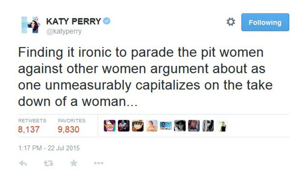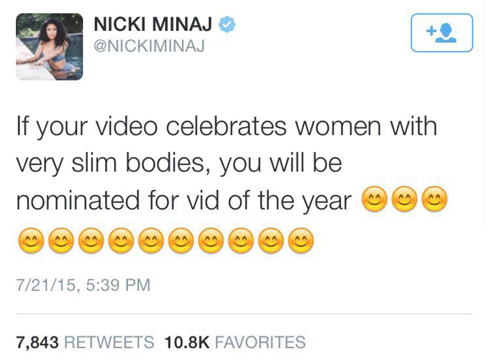 What truly bothers me about the situation is that Nicki Minaj was bringing light to a situation that very few people discuss. Women of color do not always get the recognition they deserve in the music industry. But what was worse is that instead of supporting Nicki and using her platform to shed light on the issue of inequality in the music industry, Taylor Swift used this chance to play victim and assume that Nicki was throwing shade at her. The bigger irony of Taylor Swift's statements was her mentioning the fact that Nicki was pitting women against each other. But the video that she filmed that was nominated for and won Video of the Year was a song and video that glorified pitting women against each other, in which Katy Perry was quick to tweet about: