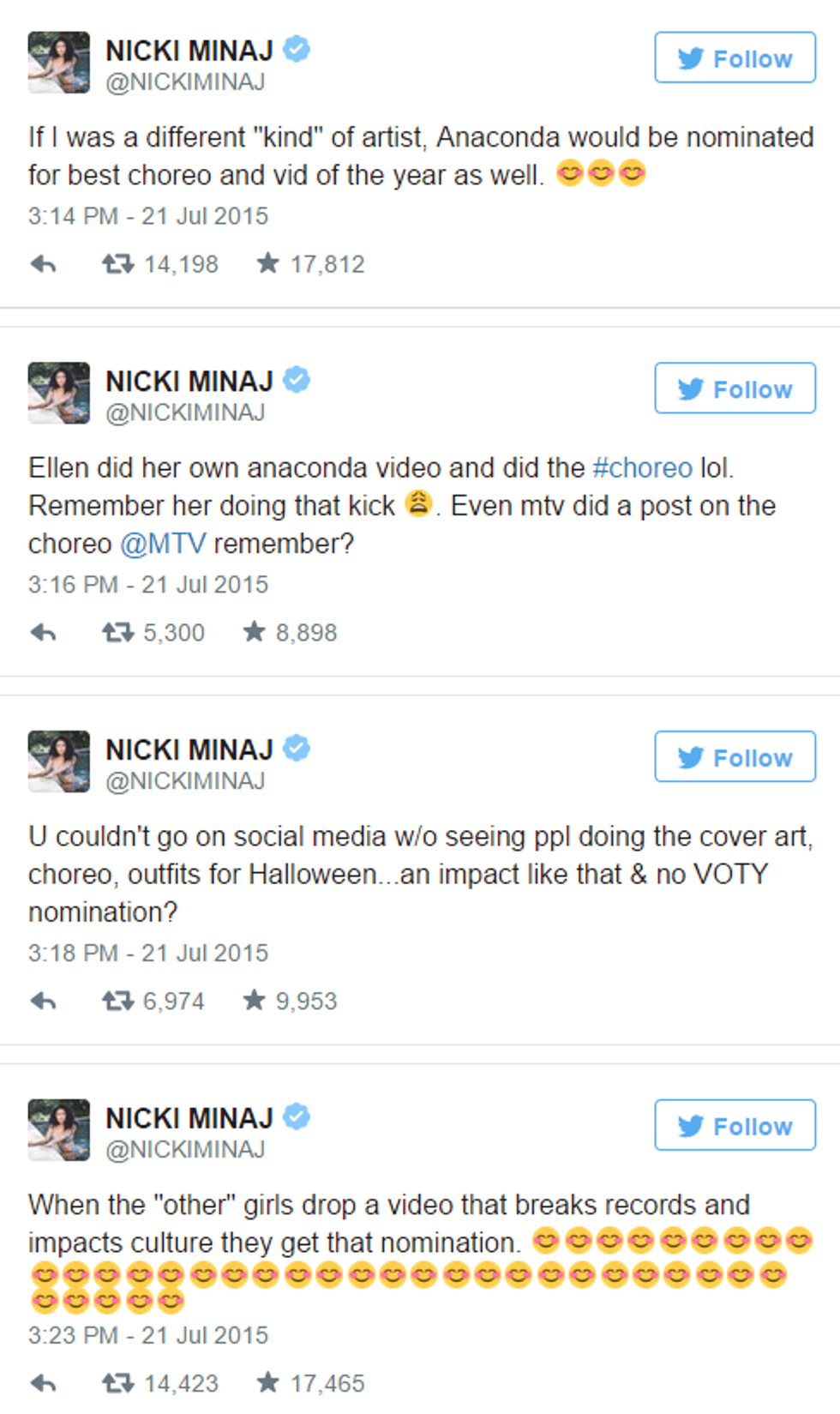 White feminism, as described by feministculture.com, is that "white feminists are generally white middle class women who focus only on issues that affect the white cis woman." A lot of the issues that Taylor Swift addresses are only about issues that the white feminist faces. Around this time last year, Nicki Minaj took to Twitter to discuss her discourse with the fact that her song "Anaconda" was not nominated for Video of the Year.