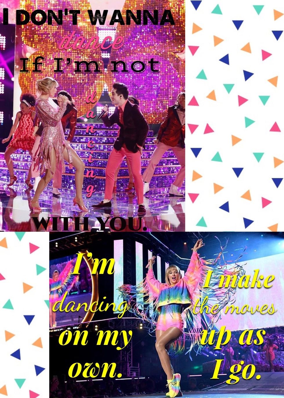 -I'm dancing on my own. I make the moves up as I go. (Shake It Off)