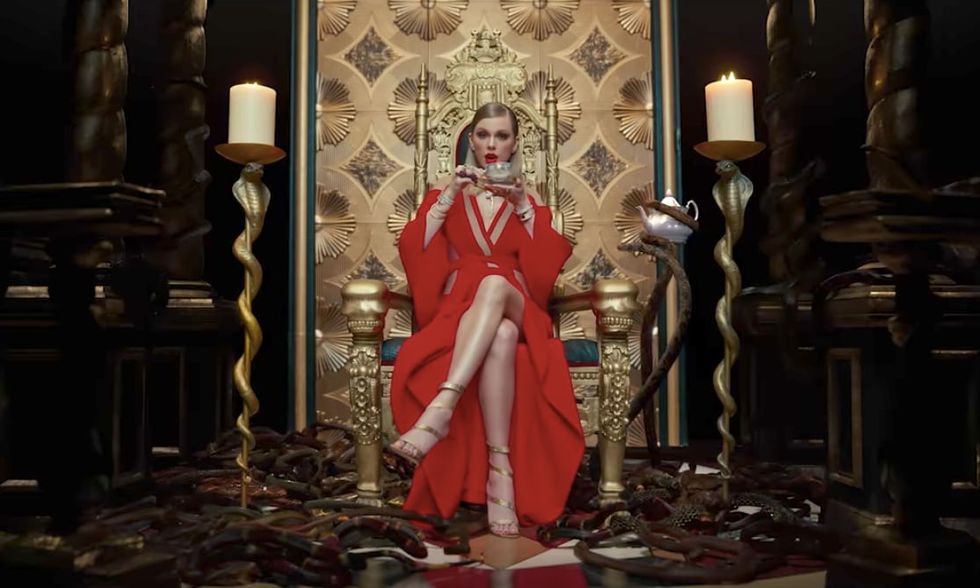 Not only is she chilling with snakes, but she and the snakes are on such good terms, one of them is actually serving her tea. This is supposedly relating back to the Kimye drama, and Taylor's newfound reputation (get it, it's the name of the album?) as a snake. This is her way of showing the haters they won't get her down, and she is gonna own her reputation.