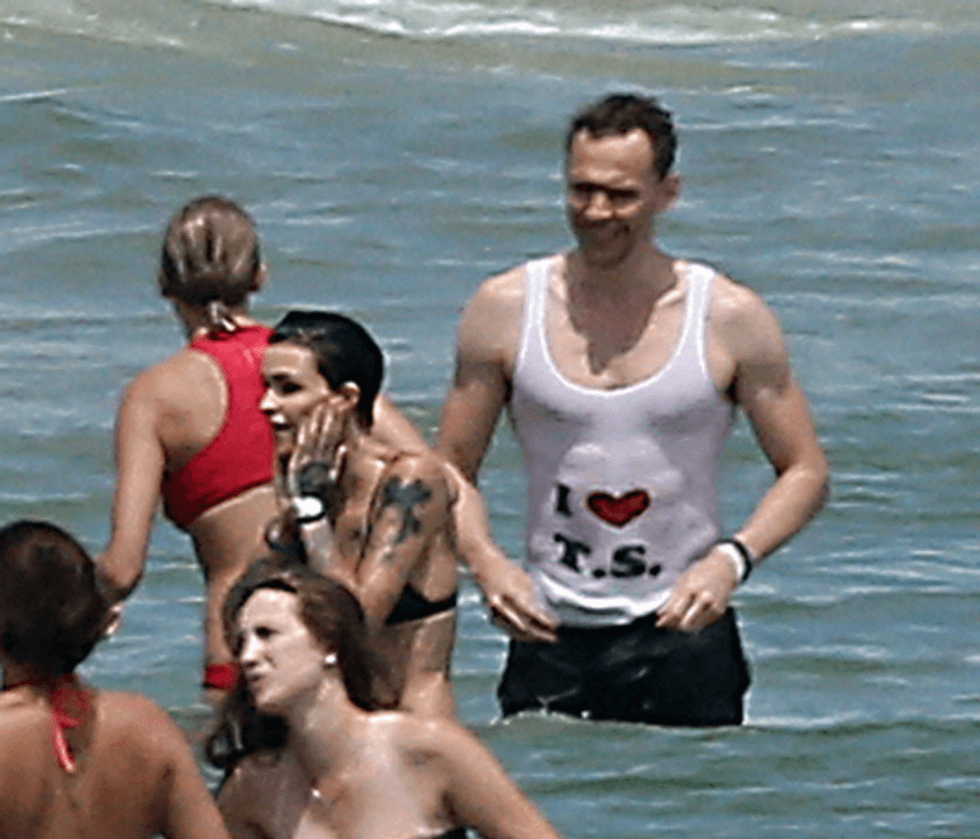 At around the 2:10 mark, Taylor has collected a bunch of backup dancers, all wearing the same crop top with "I <3 TS" on the front. The same message that was on a shirt Tom Hiddleston was caught wearing while out on the beach in Rhode Island with Taylor.