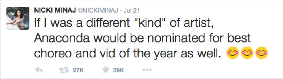 On the other hand, Nicki had every right to vent and share her opinion about the nomination snub. The points she made weren't wrong and women who don't fit the ideal image of perfection are kind of pushed to the back burner. But is this a racial issue? Is it a feminist issue? I think Nicki was aiming at both. Nicki is doing big things in the music industry and whether you love her or hate her, you know her name. I think what she was trying to accomplish with these tweets was awareness. She was trying to call out the industry and show us how unfair they are being toward women of color. I also think she was taking a stand for others and not for herself. Like Taylor Swift with Apple Music, I think Nicki was doing this for future artists so they won't get looked over. The VMAs can't go back and change the nominations but they can change things in the future. Although Nicki's choice of words were not the most polite, she was speaking off of emotion and it got people to pay attention...except they are paying attention to the wrong thing.
