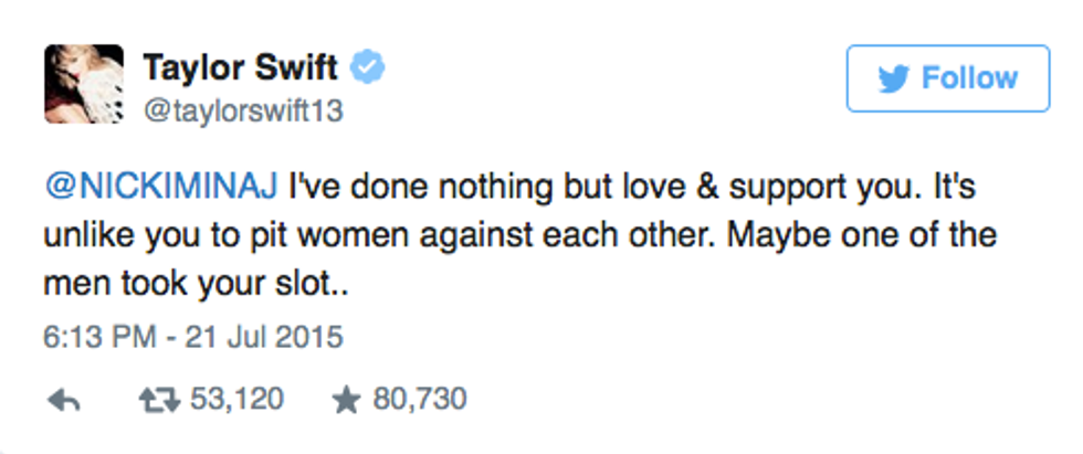 So, unless you've been living under a rock, you've probably heard about the big feud between Taylor Swift and Nicki Minaj regarding this year's VMA nominations. However, in case you haven't here is a brief summary of the situation. The VMA nominations were released on Tuesday and many people were shocked that Nicki Minaj's " Anaconda " wasn't nominated for the award Video of the Year. So, Nicki took to Twitter to vent: