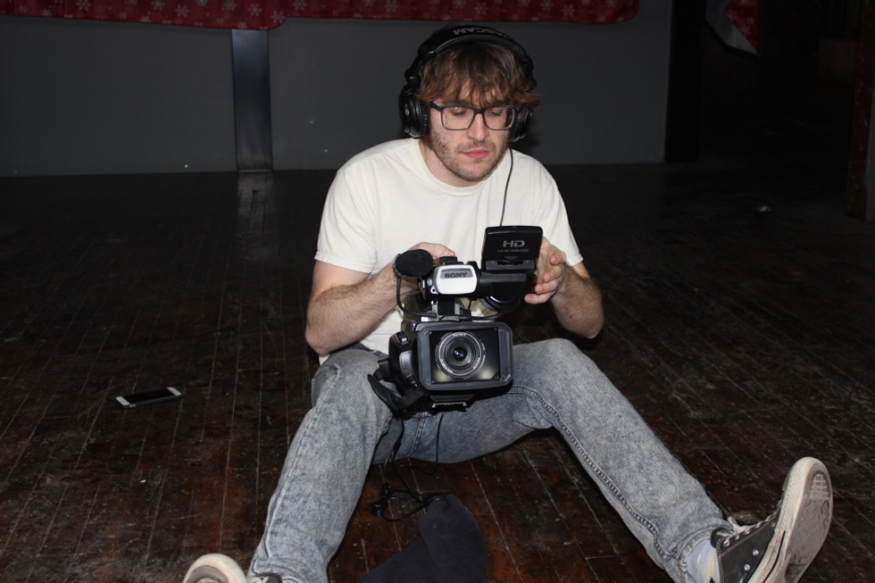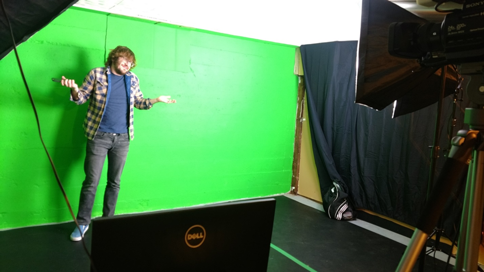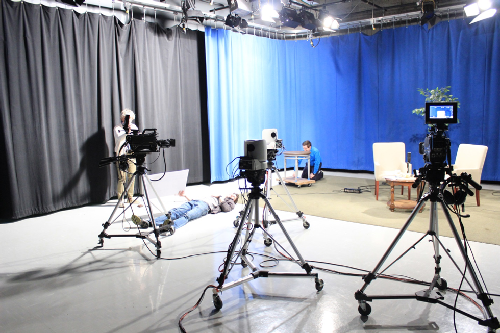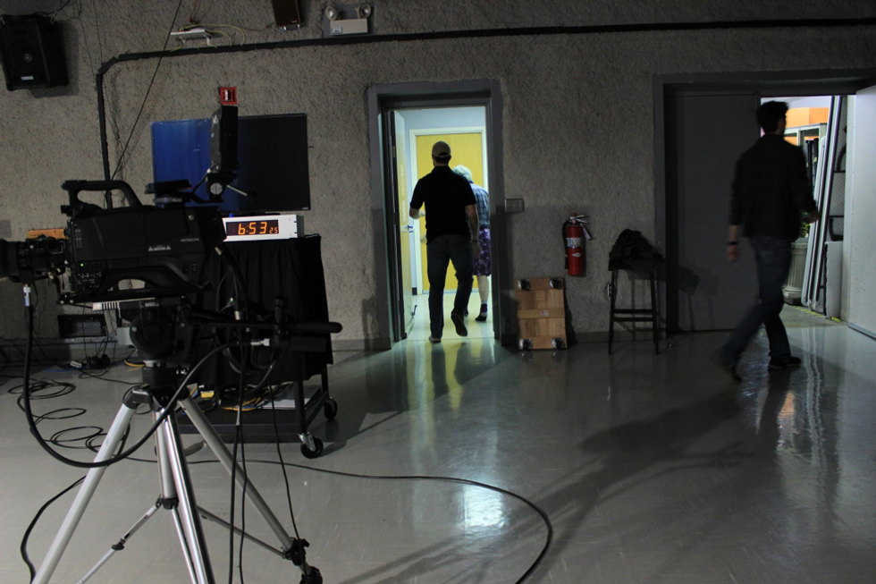 -This is inside the studio at DATV during a recent skit. Brandon is on the left behind the camera, Tyler's laying on the floor, and our friend Jimmy is rigging something in the corner.
