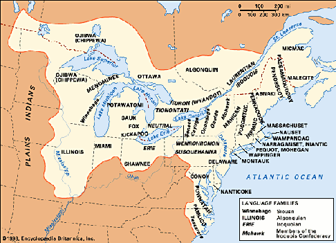 This region stretches from Canada to North Carolina and inland to the Mississippi River Valley. It was the region that had the most contact with the original settlers of America. There were two main groups, based on the languages they spoke. There were the Iroqouian speakers (Cayuga, Oneida, Erie, Onondaga, Seneca, Tuscarora) and the Algonquian speakers (Pequot, Fox, Shawnee, Wampanoag, Delaware, Menominee). There were also the Miami, the Algonuian, and the Illinois tribes.